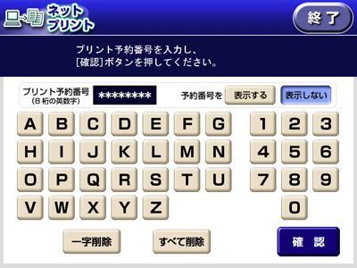 |  | 確認ボタンを押し、キーボード画面で、 メモしたプリント予約番号を入力。 8ケタの英数字。 例 SEA P B 04 R 英語のオーと間違えないでね。 |